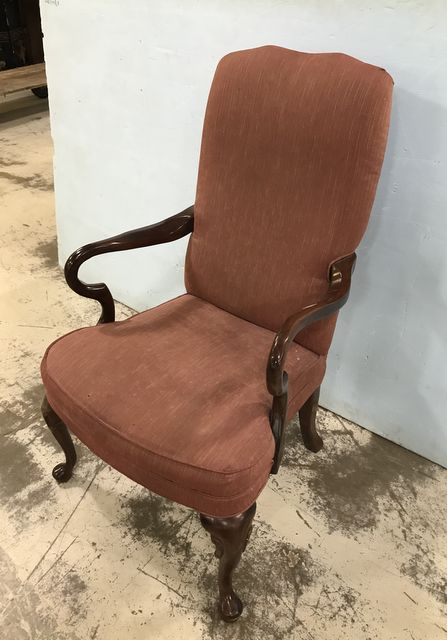 Vintage Queen Anne High Back Arm Chair, has few small stains on fabric, cherry, 42"h. Vintage Queen Anne High Back Arm Chair, has few small stains on fabric, cherry, 42"h.