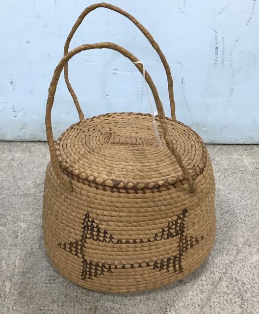 Woven handed basket, with lid, side design, 9"h. Woven handed basket, with lid, side design, 9"h.