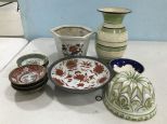 Japanese pitcher, Hong Kong porcelain bowls, small porcelain planter, Italian hand painted wall pocket. Japanese pitcher, Hong Kong porcelain bowls, small porcelain planter, Italian hand painted wall pocket.
