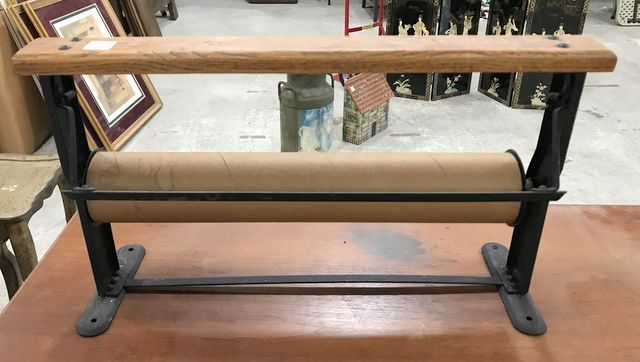Metal paper roll stand, metal frame with wood top, packing paper roll, 12"h., 22"w. Metal paper roll stand, metal frame with wood top, packing paper roll, 12"h., 22"w.