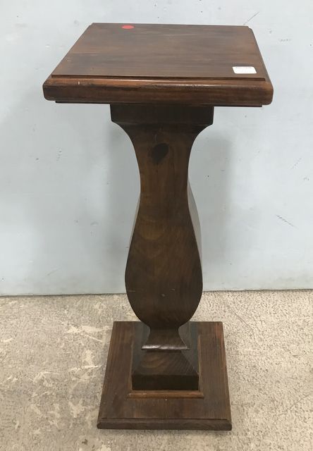 Ethan Allen Stained Pine Pedestal, plant stand, exposed to mildew, 28"h., 10"w. Ethan Allen Stained Pine Pedestal, plant stand, exposed to mildew, 28"h., 10"w.