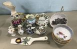 Group of Hand Painted Porcelain Pottery, four limoge bowls, hand painted pitchers, cup and saucers, pie server, collectible plate. Group of Hand Painted Porcelain Pottery, four limoge bowls, hand painted pitchers, cup and saucers, pie server, collectible plate.