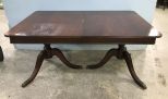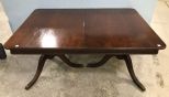 Mahogany Duncan Phyfe Dining Table, double pedestal, brass cap feet, worn condition, 29"h., 61"long., 41"w. Mahogany Duncan Phyfe Dining Table, double pedestal, brass cap feet, worn condition, 29"h., 61"long., 41"w.