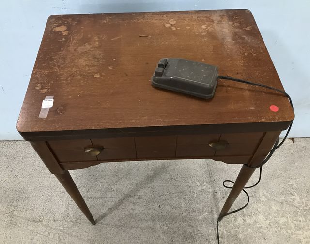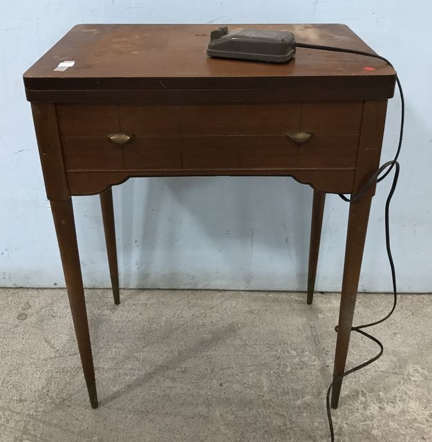 Sewing Machine Cabinet with Singer Machine, with stool, exposed to mildew, 32"h., 25"w. Sewing Machine Cabinet with Singer Machine, with stool, exposed to mildew, 32"h., 25"w.