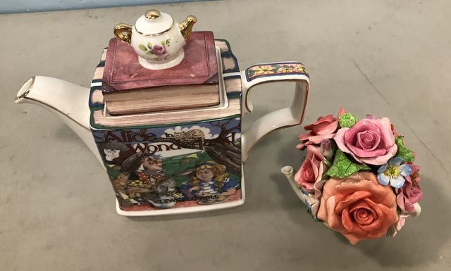 Alice & Wonderland Teapot 7"h., Small Teapot with flower bouquet lid. Alice & Wonderland Teapot 7"h., Small Teapot with flower bouquet lid.