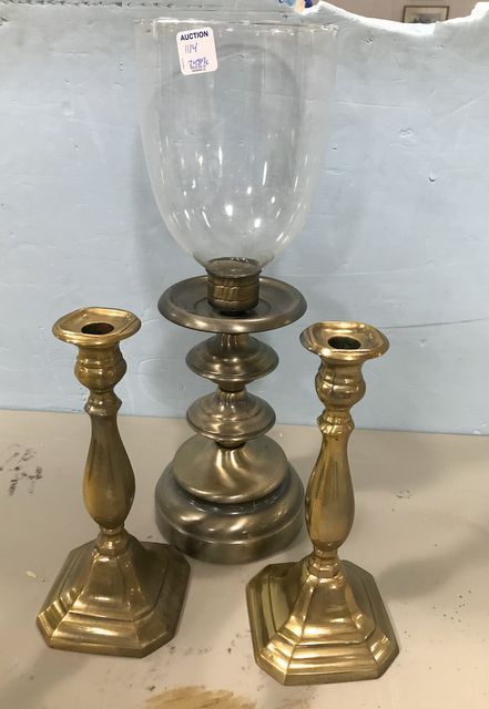 Glass Shade Candle Holder 18"h., and Colonial Style Brass Candle Holders Glass Shade Candle Holder 18"h., and Colonial Style Brass Candle Holders