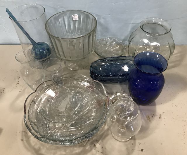 Group of Clear glass, glass compote, blue vase, round glass dish, vases. Group of Clear glass, glass compote, blue vase, round glass dish, vases.