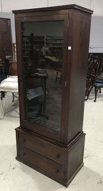 Nice Wood 10 Gun Cabinet, single glass door, two drawers, exposed to mildew, 70"h., 27"w., 14"d. Nice Wood 10 Gun Cabinet, single glass door, two drawers, exposed to mildew, 70"h., 27"w., 14"d.