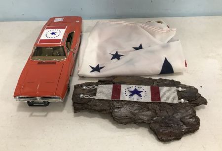 General Lee model car with stennis flag, Stennis Flag, and tree bark with beaded stennis flag. General Lee model car with stennis flag, Stennis Flag, and tree bark with beaded stennis flag.