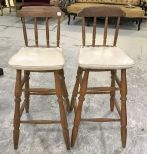 Pair of Vintage Wood Bar Stools, white vinyl seats, spindle back, exposed to mildew. Pair of Vintage Wood Bar Stools, white vinyl seats, spindle back, exposed to mildew.