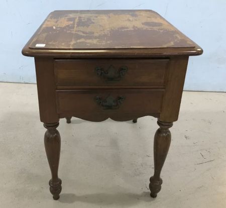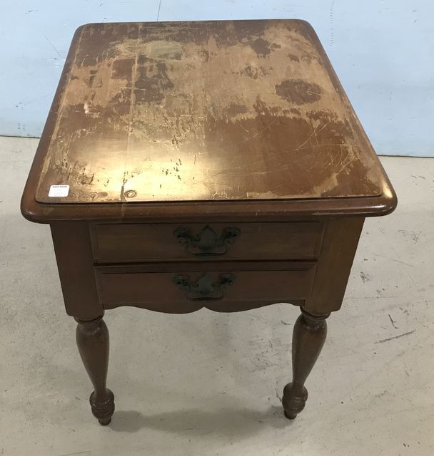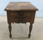 Early American Style Lamp Table/side table, two drawers, top is worn, 20"h., 24"d. Early American Style Lamp Table/side table, two drawers, top is worn, 20"h., 24"d.