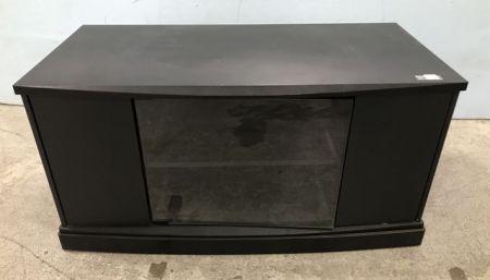 Particle Black Painted Tv Stand, glass door with shelf, used, 18"h., 36"w., 18"d. Particle Black Painted Tv Stand, glass door with shelf, used, 18"h., 36"w., 18"d.