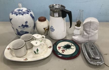 Assorted Group of Pottery and Porcelain, Blue and white urn, pottery butterfly, enamel coffee pot, porcelain tray, salt and pepper, mugs, Gail Pittman hot plate, silver plate butter dish, ceramic white boot, lantern. Assorted Group of Pottery and Porcelain, Blue and white urn, pottery butterfly, enamel coffee pot, porcelain tray, salt and pepper, mugs, Gail Pittman hot plate, silver plate butter dish, ceramic white boot, lantern.