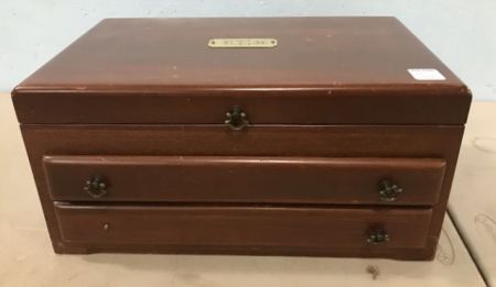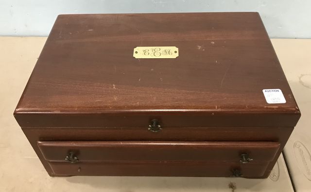 Cherry flatware box, lift top, has monogrammed tag, missing one knob, has scratches, 7"h., 15"w. Cherry flatware box, lift top, has monogrammed tag, missing one knob, has scratches, 7"h., 15"w.