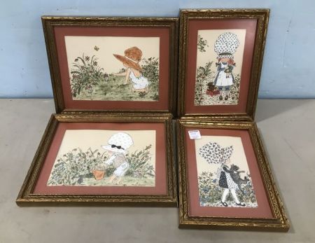 Set of Four Pen and Ink by Jenny Tarkington, gold gilt frame, Children in Garden, 9" x 11", 10" x 7". Set of Four Pen and Ink by Jenny Tarkington, gold gilt frame, Children in Garden, 9" x 11", 10" x 7".