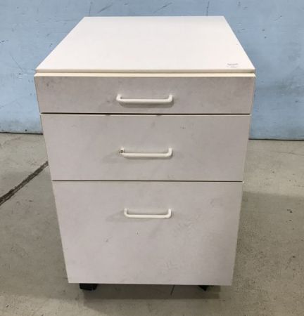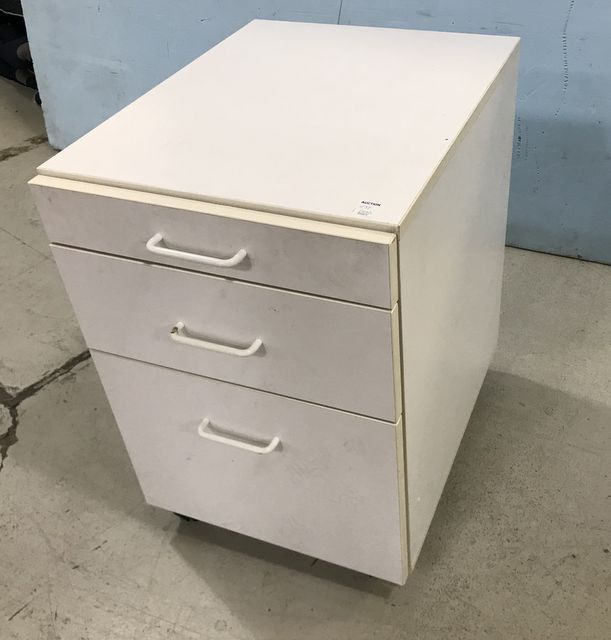 Three Drawer White Cabinet , on wheels, one is damaged, 23"h., 16"w. Three Drawer White Cabinet , on wheels, one is damaged, 23"h., 16"w.