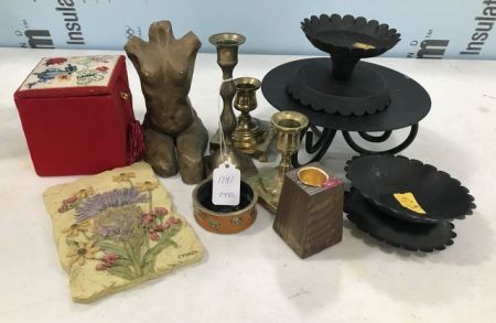 Brass and black painted candle holders, Cynara flower art plaque, nude statue. Brass and black painted candle holders, Cynara flower art plaque, nude statue.