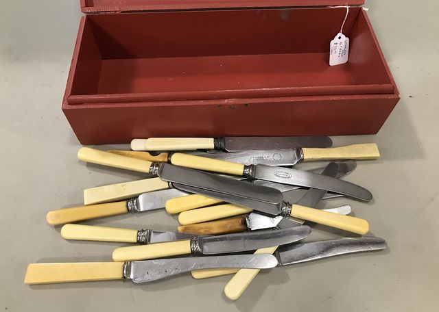 Sheffield stainless knives, bake lite handles, some damaged, include red storage box. Sheffield stainless knives, bake lite handles, some damaged, include red storage box.
