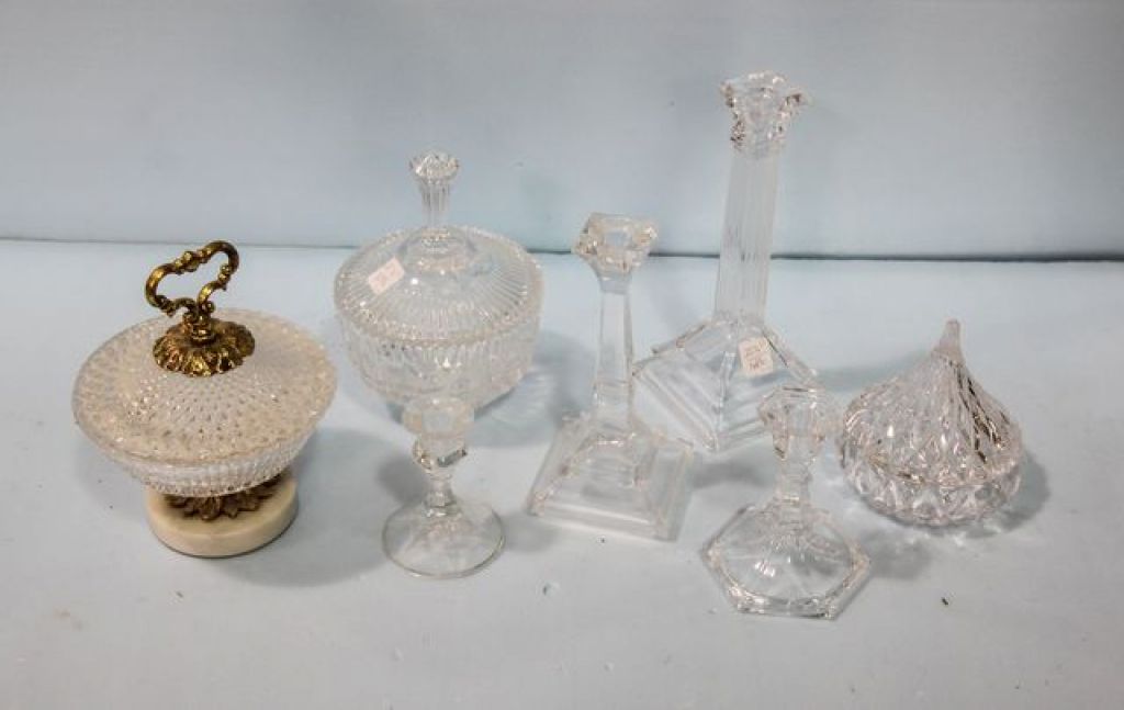 Two pairs of clear candlesticks, kiss candy jar and two covered candy dishes Two pairs of clear candlesticks, kiss candy jar and two covered candy dishes