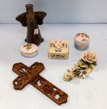 Italian hand painted porcelain flowers, three small covered ring boxes, wood carved cross and angel pottery candlestick Italian hand painted porcelain flowers, three small covered ring boxes, wood carved cross and angel pottery candlestick