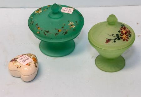 2820 Two Satin Glass Covered Dishes & Heart Shaped Porcelain Box