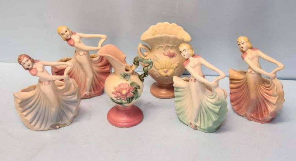 Two pairs of Hull pottery lady/fan dress vases, Hull 6 1/2" h. ewer and Hull 6 1/2: vase Two pairs of Hull pottery lady/fan dress vases, Hull 6 1/2" h. ewer and Hull 6 1/2: vase