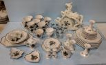 Seven dinner plates, salad plate, four bread plates, eight saucers, eight cups, four mugs, sugar, creamer, four candlesticks, two tealights, three glasses, tray, bowl and two nut dishes Seven dinner plates, salad plate, four bread plates, eight saucers, eight cups, four mugs, sugar, creamer, four candlesticks, two tealights, three glasses, tray, bowl and two nut dishes