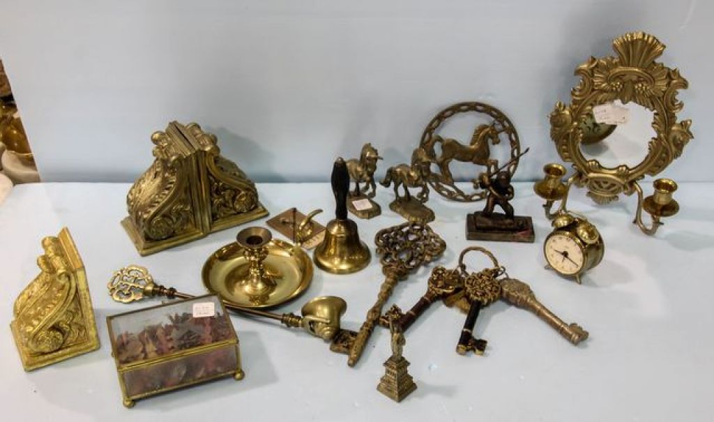 Brass wall sconce 8" w., 11" h., three gold bookends, decorative keys, brass trivet, hand bell, candlestick, Linden clock, golfer and trinket box Brass wall sconce 8" w., 11" h., three gold bookends, decorative keys, brass trivet, hand bell, candlestick, Linden clock, golfer and trinket box