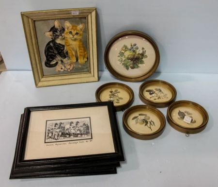 Four 6" dia. fruit prints, one 9" round fruit print and four 10 1/2" w., 12 1/2" h. various prints Four 6" dia. fruit prints, one 9" round fruit print and four 10 1/2" w., 12 1/2" h. various prints