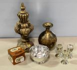 Decorative gold finial, incense burner, plated 4" dia. dish, three liquors and decorative vase Decorative gold finial, incense burner, plated 4" dia. dish, three liquors and decorative vase