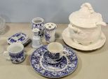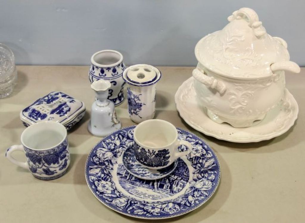 White ceramic soup tureen, various blue and white pieces including cups, plate, box, 4" h. vase and hand painted bell White ceramic soup tureen, various blue and white pieces including cups, plate, box, 4" h. vase and hand painted bell