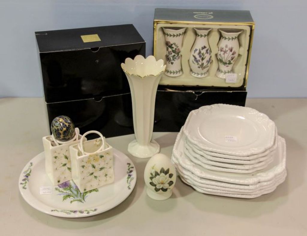 Three 9" h. Mikasa vases, box with three 5" h. vases, five Italian dinner plates, five salad plates, plate, two eggs and two porcelain sacks Three 9" h. Mikasa vases, box with three 5" h. vases, five Italian dinner plates, five salad plates, plate, two eggs and two porcelain sacks