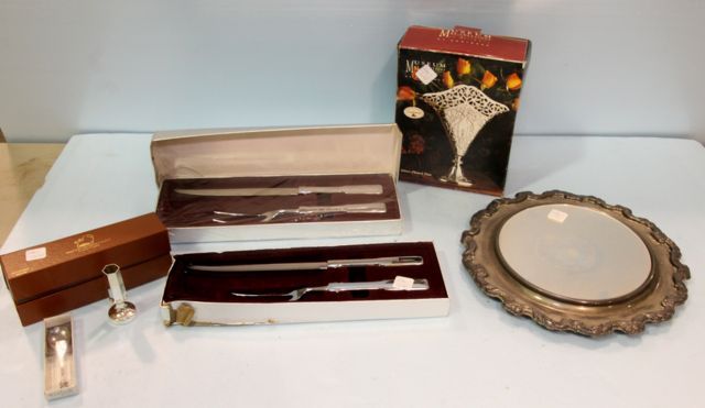 Silverplate fan vase, souvenir spoon, two Carvel Hall carving sets, plateau mirror and two silverplate toothpick holders Silverplate fan vase, souvenir spoon, two Carvel Hall carving sets, plateau mirror and two silverplate toothpick holders