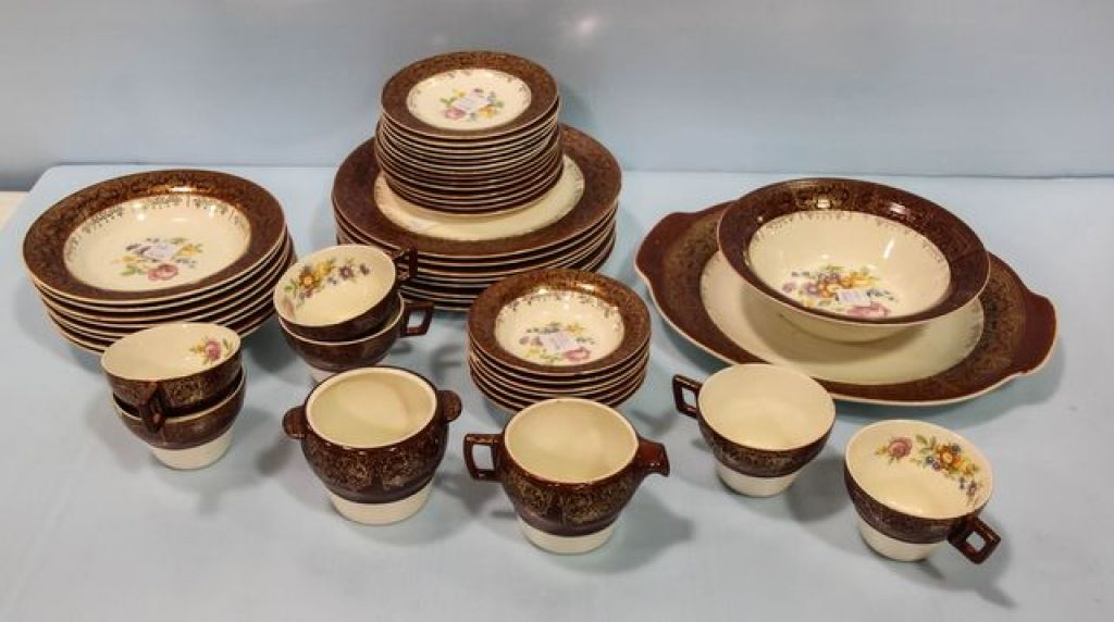 Eight plates, seven bread/butter plates, eight salad bowls, seven berry bowls, six cups, seven saucers, vegetable bowl, platter, creamer and sugar. (Chips) Eight plates, seven bread/butter plates, eight salad bowls, seven berry bowls, six cups, seven saucers, vegetable bowl, platter, creamer and sugar. (Chips)