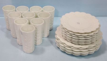 Six milk glass dinner plates, seven milk glass salad plates and ten glasses Six milk glass dinner plates, seven milk glass salad plates and ten glasses