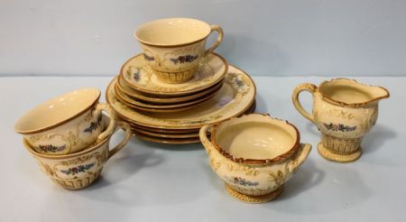 Three cups, four saucers, creamer, sugar and four salad plates Three cups, four saucers, creamer, sugar and four salad plates