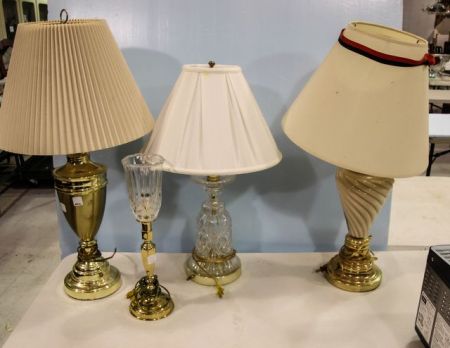 Brass lamps, porcelain lamp and two lead crystal lamps Brass lamps, porcelain lamp and two lead crystal lamps