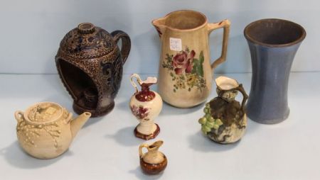 Blue pottery vase, blue candle holder, pitcher, three small pitchers and teapot Blue pottery vase, blue candle holder, pitcher, three small pitchers and teapot