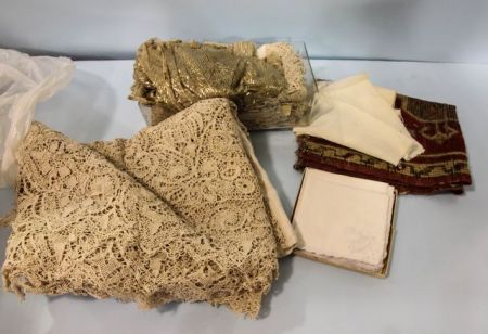 Lace tablecloth, napkins, prayer rug and beaded table runner Lace tablecloth, napkins, prayer rug and beaded table runner