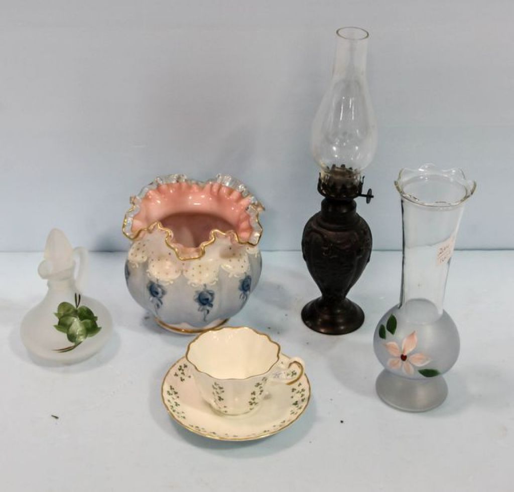 Hand painted rose bowl, hand painted vase, hand painted cruet, small oil lamp, cup and saucer Hand painted rose bowl, hand painted vase, hand painted cruet, small oil lamp, cup and saucer