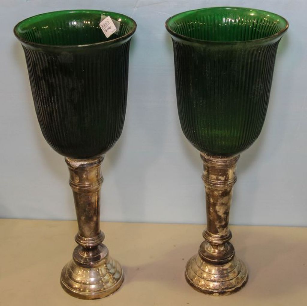 2245 Pair of Silverplate and Green Glass Hurricane Candlesticks