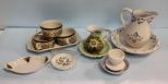 Three porridge bowls, two pitchers, bowls and relish dish Three porridge bowls, two pitchers, bowls and relish dish
