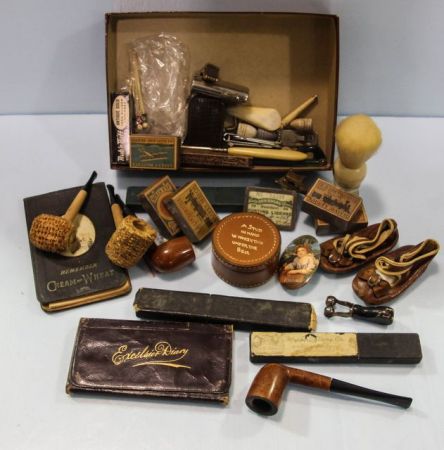 Includes match boxes, straight razors, pipes and shaving brush Includes match boxes, straight razors, pipes and shaving brush