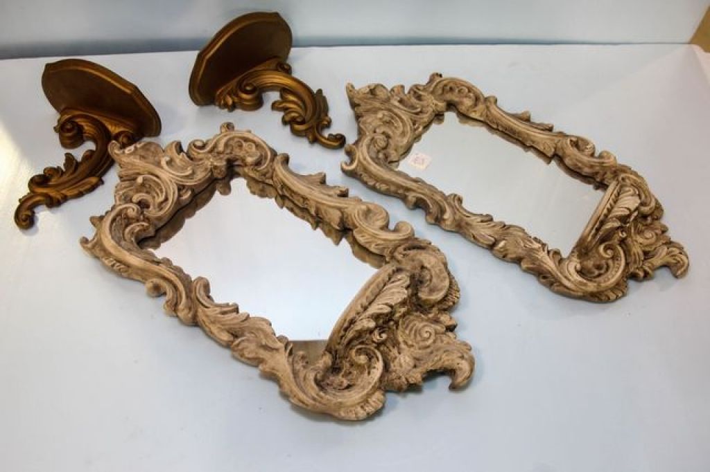 2904 Pair of Resin Framed Wall Mirrors & Pair of Small Gold Wall Shelves