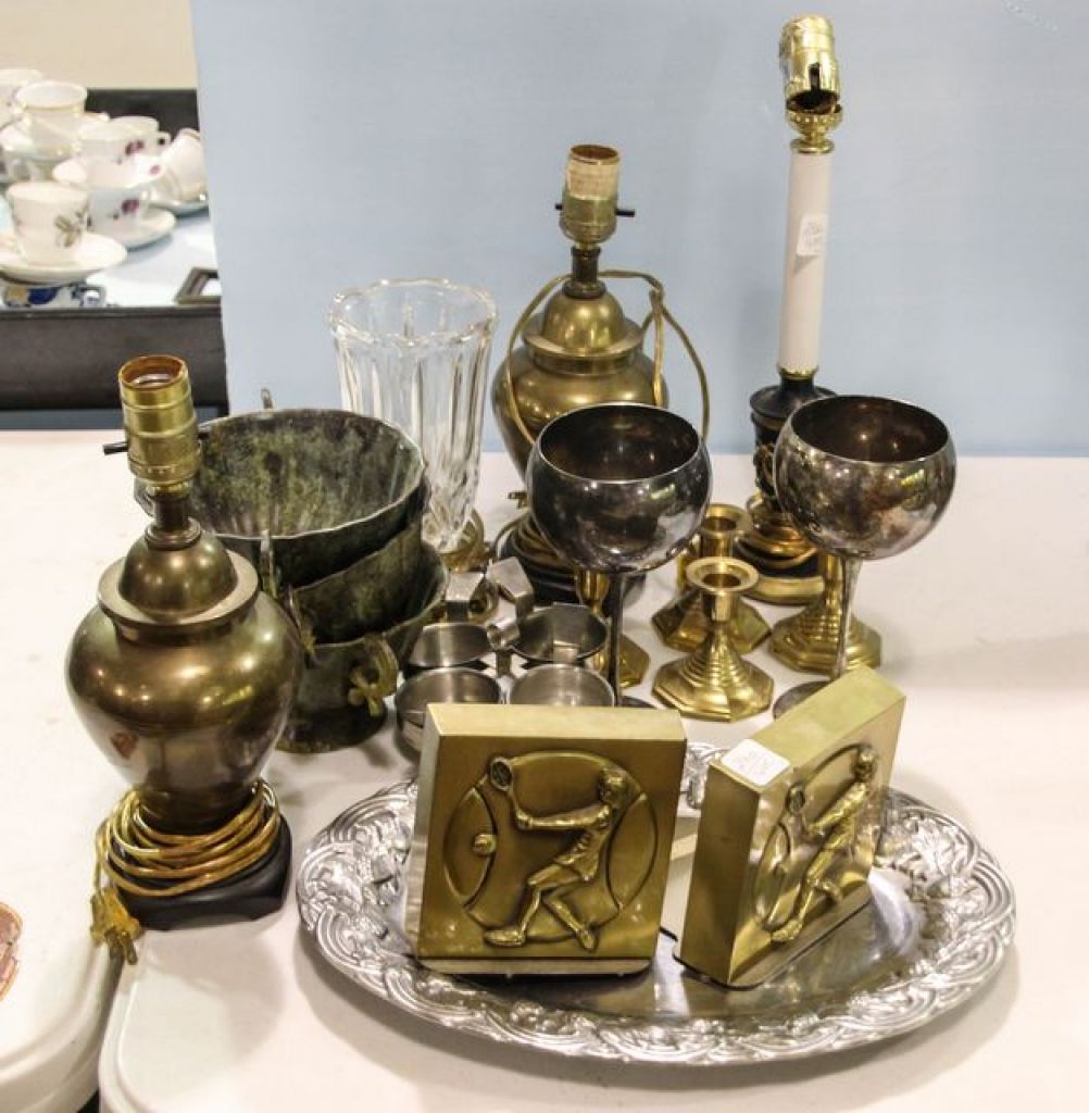 Two silverplate goblets, four brass candle holders, two brass lamps, three metal planters, brass golf bookends and platter Two silverplate goblets, four brass candle holders, two brass lamps, three metal planters, brass golf bookends and platter