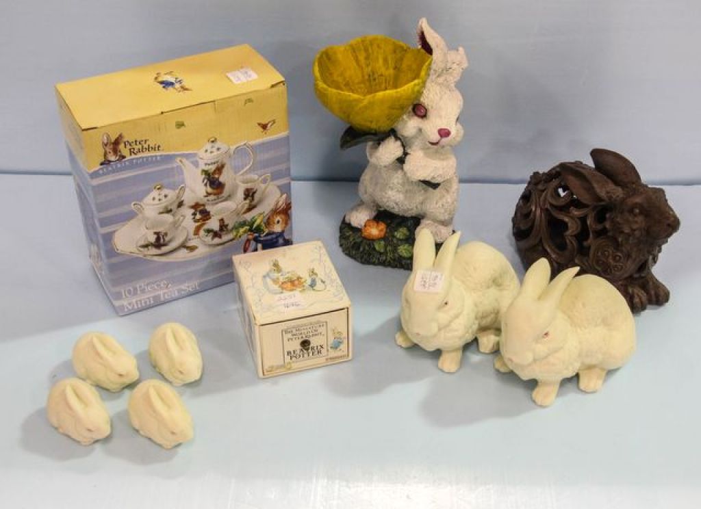 Eight resin rabbits, ten piece mini tea set and miniature of Peter Rabbit Eight resin rabbits, ten piece mini tea set and miniature of Peter Rabbit