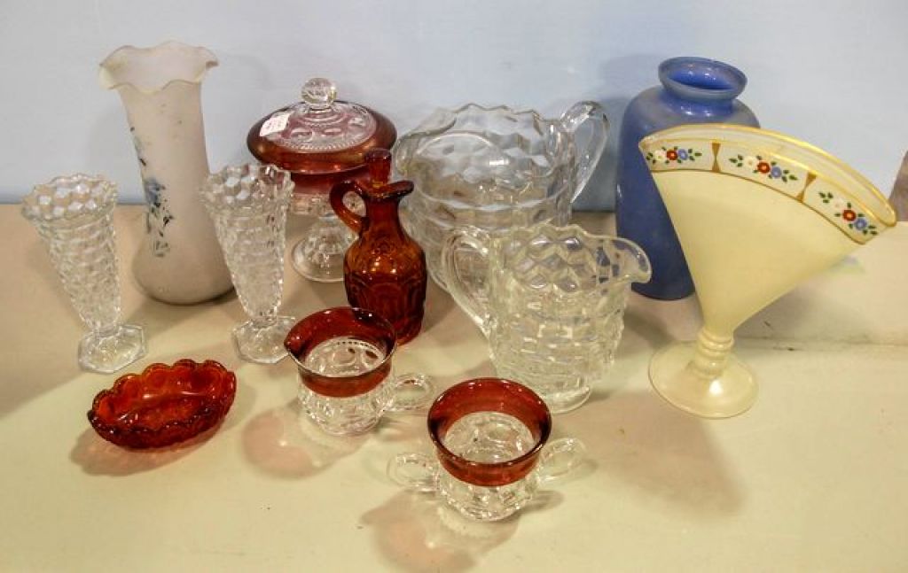 Including glass vases, candy dish, cups and pitchers Including glass vases, candy dish, cups and pitchers