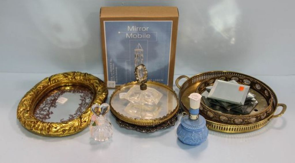 Small 11"x 9" oval mirror, mirror mobile, three perfume bottles & 7" dia. plateau Small 11"x 9" oval mirror, mirror mobile, three perfume bottles & 7" dia. plateau