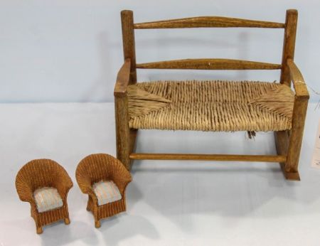 2260 Small Doll Rocking Settee & Two Wicker Doll Chairs