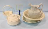 Ceramic bowl and pitcher, platter, covered pot, basket and stand Ceramic bowl and pitcher, platter, covered pot, basket and stand